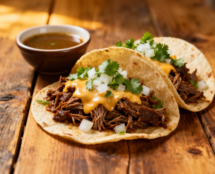 Σιγομαγειρεμένο μοσχαρί σε crunchy τορτίγιες με λιωμένο τυρί, κρεμμύδι, κόλιανδρο και ζωμό για βούτηγμα. Πικάντικη, ζουμερή απόλαυση!